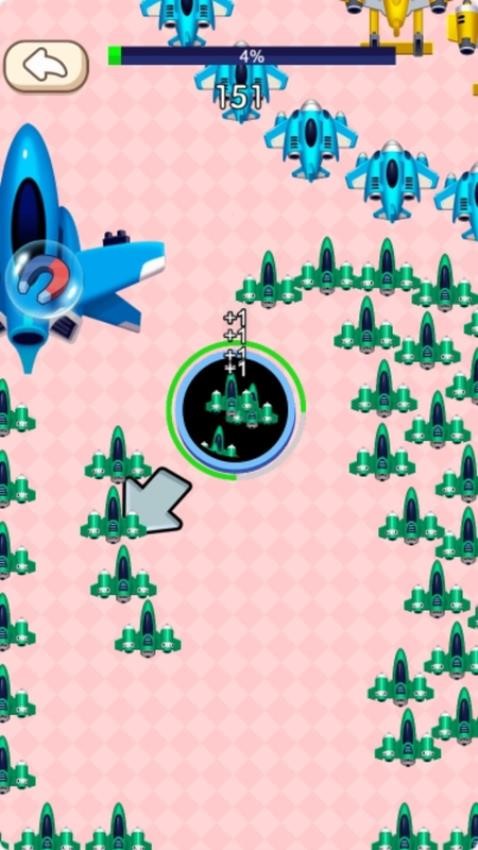 4、这里是战斗机吞噬界面,控制你的黑洞一直在游戏界面移动,移动的过程就自动吞噬战斗机。