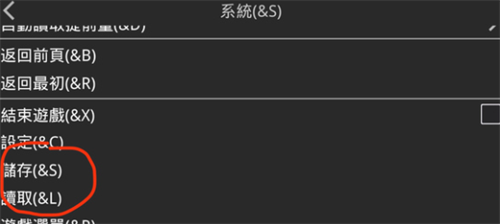 点击后进入选项界面(图二),选择画圈处的“Gamemenu”按钮,再进入系统设置页并向下滚动,即可在显著位置找到【读档/存档】功能入口(图三、图四)。