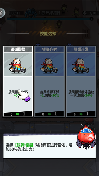 前3次技能选择中,务必锁定“银弹增幅”——直接提升60%基础攻击力,秒杀杂兵、压制精英、化解包围,为中期转型打下绝对输出根基。