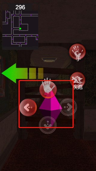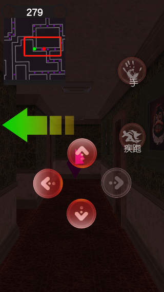 游戏采用虚拟按键操作:方向键控制角色移动,“手”按钮可释放定身技能,“疾跑”则用于快速冲刺,有效躲避怪物追击。