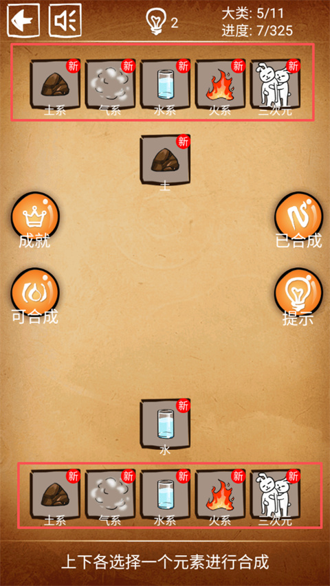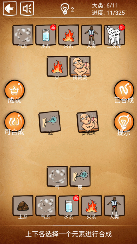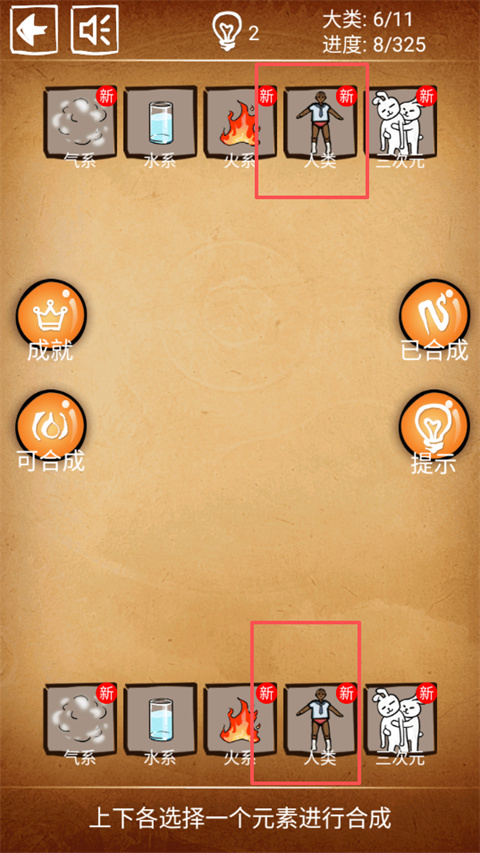 1、从屏幕上方和下方的元素栏中各选一个元素进行合成。