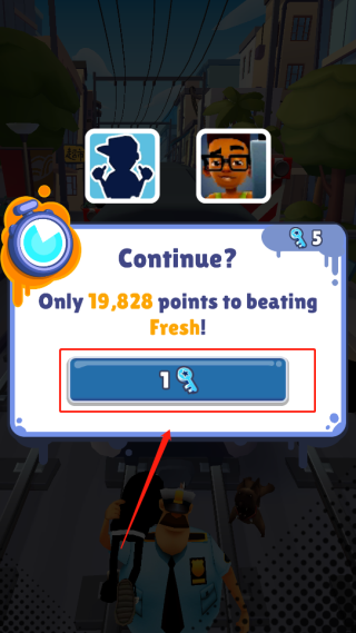 4、若撞上障碍物或被警察追上,游戏将结束;此时可使用“钥匙”道具立即复活继续奔跑。