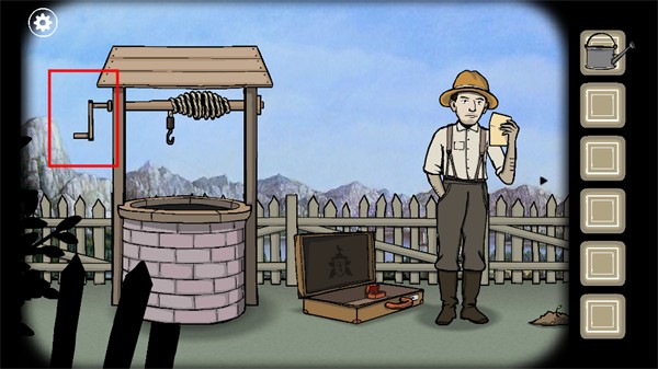 5、拾取场景右侧的花洒,前往水井处,将花洒放入井中,点击左侧的滚轮阀使其下降装水,再次点击滚轮阀收回已装满水的花洒;