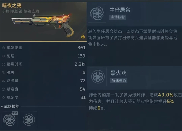 内测人气武器正式转为主武器位。主动技能「牛仔居合」消耗整弹匣实现最多六连发高命中爆发;被动「黑火药」首发射击为爆炸弹,附加43%攻击力伤害并提升目标所受火焰伤害5%。