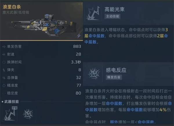 单发伤害高达883点。主动技能「高能光束」通过命中叠层触发爆发;被动「感电反应」每层命中层数提升4%伤害,弱点命中额外+1层,满层后输出爆炸。