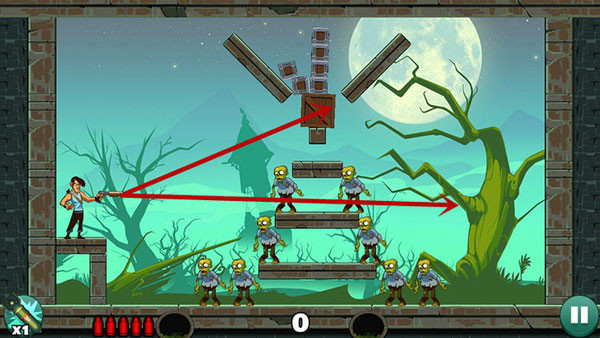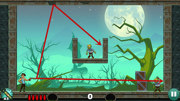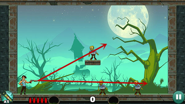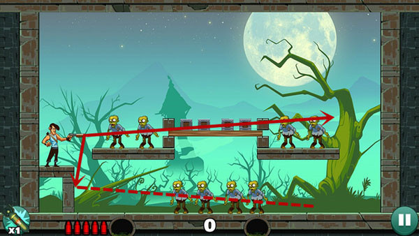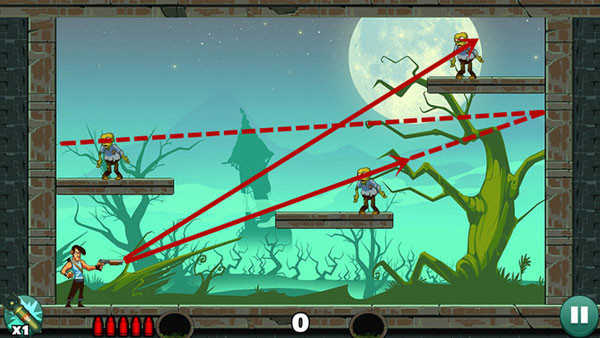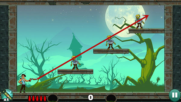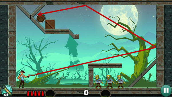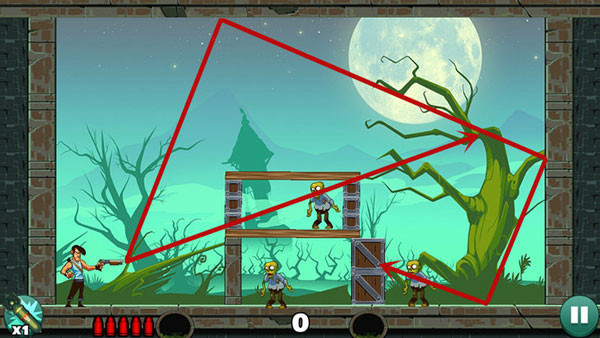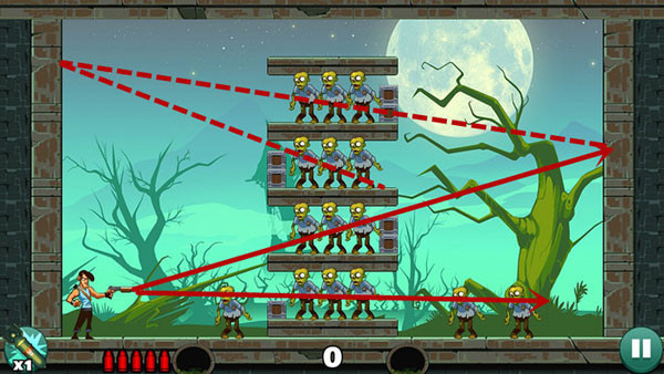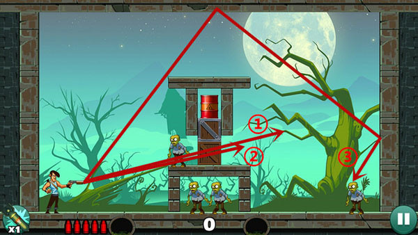 操作相对轻松,底部僵尸可直线射击解决,上方敌人则需借助墙面反射命中。若角度掌握不熟,多试几次即可找到最佳方案。
