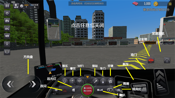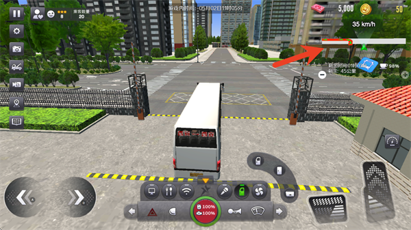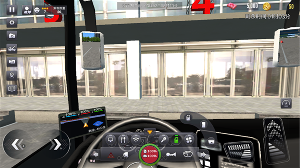 2. 操作方式:左侧屏幕控制方向(左/右),右侧区域控制油门、刹车及倒车。此外,界面还设有车门开关等车辆功能按钮,需适时操作以服务乘客。
