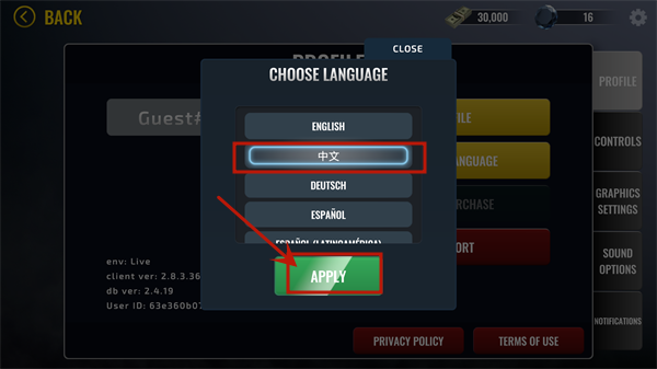 3. 在语言列表中选择“中文”,点击“APPLY”按钮即可完成语言切换。