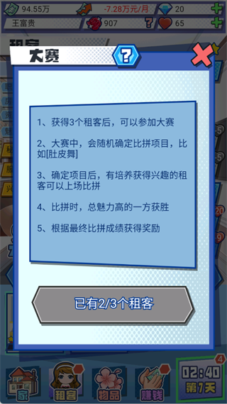 ? 赛前集中资源提升租客兴趣等级与总魅力值,形成属性优势,确保在比赛中获胜并获取钻石、限定家具等稀有奖励。