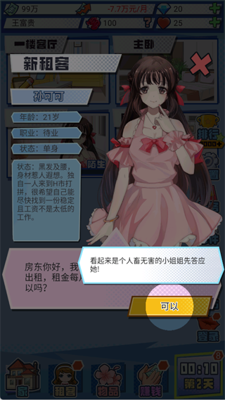 与租客的亲密关系需从点滴做起:每日聊天、赠送礼物、一起做家务、参与小游戏比拼等互动行为,不仅能提升亲密度,还能解锁兴趣培养系统,全面增强租客属性。