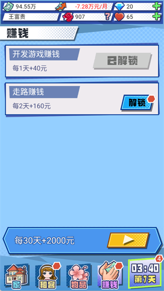1. 基础赚钱推荐:优先解锁“开发游戏赚钱”等低成本、高回报的副业,实现每日稳定增收。