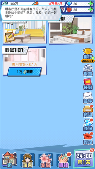 1. 游戏开局,父母为你提供100万元启动资金,并在H市中心首付一套月供8万元的别墅。首要任务是通过出租房间覆盖每月支出。