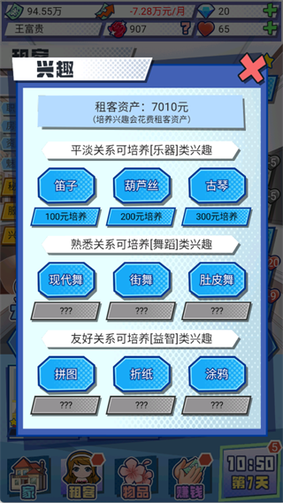 2. 兴趣培养是提升租客魅力的核心手段。优先选择乐器、绘画、舞蹈等高魅力加成项目进行培养,能显著提高租客总评分。