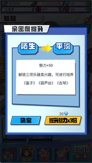 1. 每日与租客互动(如聊天、送礼)可提升亲密度,亲密度达标后将解锁兴趣培养功能,并获得属性加成,为后续PK战奠定基础。