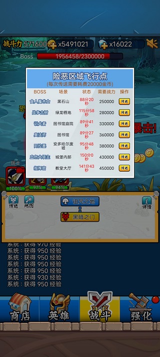 技能系统:除战士终极技能外,其余技能均可在商店用钻石购买。技能升级依赖Boss房掉落的碎片,每次提升可增加500战力。战士终极技能需在战力达23万后的Boss房中才有几率掉落。
