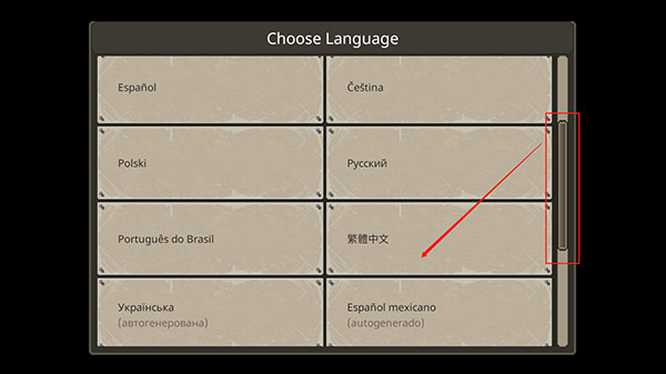 1、首次进入游戏时,在语言选择界面下滑找到“繁体中文”选项并点击确认;