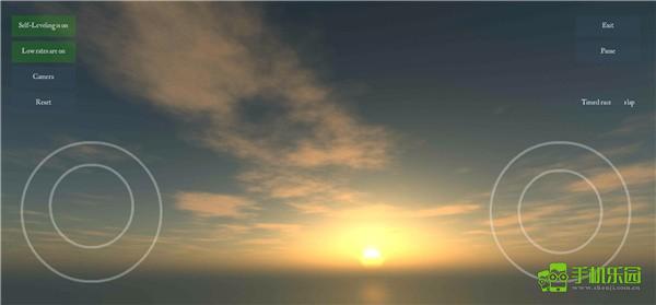 2、进入飞行界面后,左侧功能按钮依次为:自调平开启、高帧率开启、第三人称视角切换和重置操作;右侧则设有退出与暂停按钮;