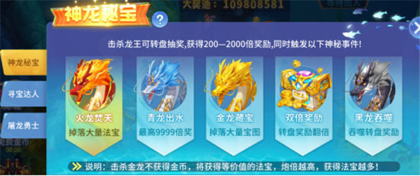 1、【神龙秘宝】—— 击杀神龙夺宝藏 在神秘海域遭遇神龙BOSS,成功击杀最高可获9999倍奖励,并掉落法宝、藏宝图等稀有道具,一夜暴富不是梦。