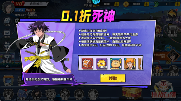 创建角色即开启0.1折特权,免费领取代金券、毕业阵容及海量充值卡。首充6元仅需0.06元,上线即可获得黑崎一护等核心角色,起步即领先。