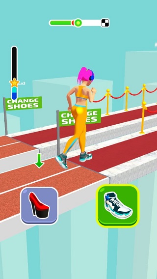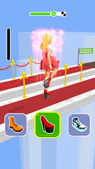 游戏采用关卡制推进模式,玩家需在女主角奔跑过程中,根据前方路况实时选择最合适的鞋子进行双人竞速对决。胜负关键在于谁先冲过终点线!途中设有各类障碍与机关,唯有精准判断、灵活应对,才能一路披荆斩棘,最终站上领奖台,成为全场瞩目的女王殿下。操作简单却节奏明快,玩法轻松又极具魔性,让人一玩就停不下来。