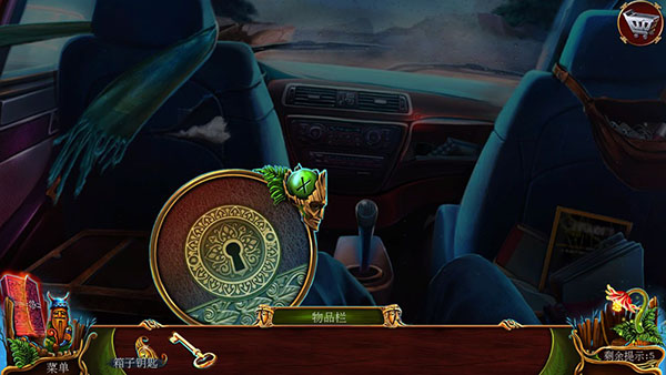 从副驾驶座背包获取手镯与指甲锉,用指甲锉撬开面板锁取得钥匙。掀开左侧衣物,用钥匙开启储物盒进入寻物环节(红色标记为显性物品,蓝色为隐藏物品),最终获得镐具。点击前挡风玻璃,用镐击碎玻璃成功脱困。