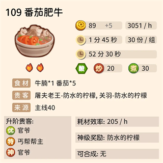 - 番茄肥牛:技法要求低、耗材友好、制作时间短,且能吸引两位贵客(关羽、老王),掉落煮系铜符文“防水柠檬”,赚钱效率达3051金币/小时,是主线111解锁池塘前的刷金首选。