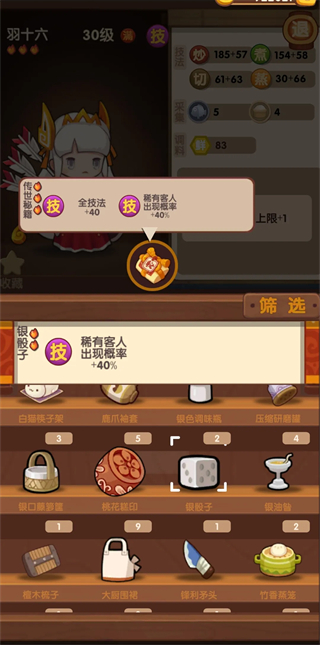- 装备增加贵客率的厨具(如传世秘籍、骰子)。