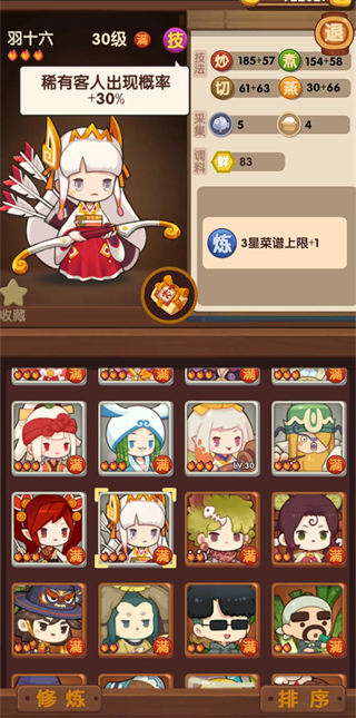 前期应优先推进主线至255关,以解锁全部游戏内容。金币优先用于升级六个采集点,随后抽满新手奖池与中级奖池中的菜谱——菜谱是经营体系的基石。