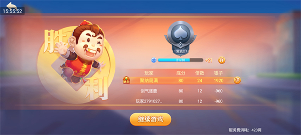 每局结束后,系统自动展示胜负结果、底分、倍数、银两收益及段位积分变化,点击“继续游戏”即可无缝开启下一局。