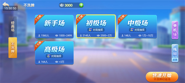 在“不洗牌”玩法中,依据当前银两数量选择对应场次——新手场、初级场、中级场或高级场,循序渐进提升实力。