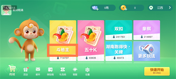 主界面清晰展示多种热门玩法,如斗地主、五十K等,点击任一模式即可进入专属对战区。