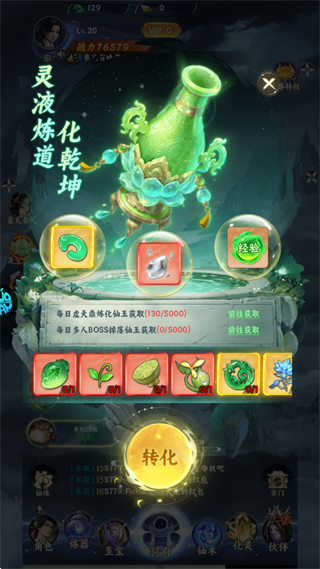 4. 在界面左侧进入灵液转化功能,可将各类基础材料高效转化为通用货币灵玉,用于技能升级、伙伴培养等关键成长环节。