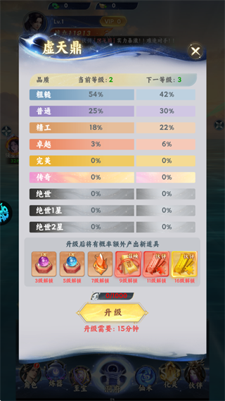 3. 利用多余装备分解所得的材料,可对虚天鼎进行升级,从而大幅提升稀有装备的产出概率,是中后期装备获取的核心途径。