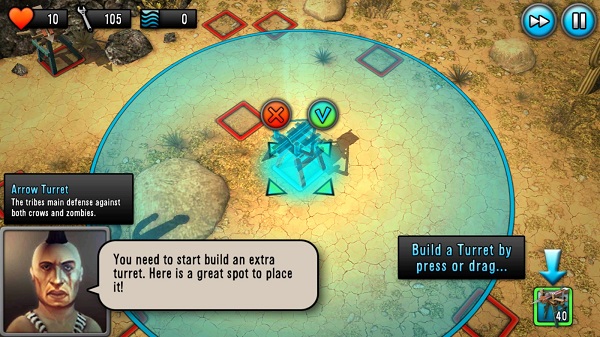 3、在地图上标有淡绿色圆点的位置建造防御塔,建造完成后点击确认按钮(√)完成部署。