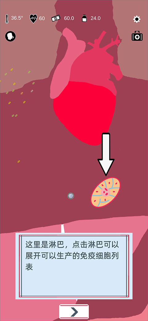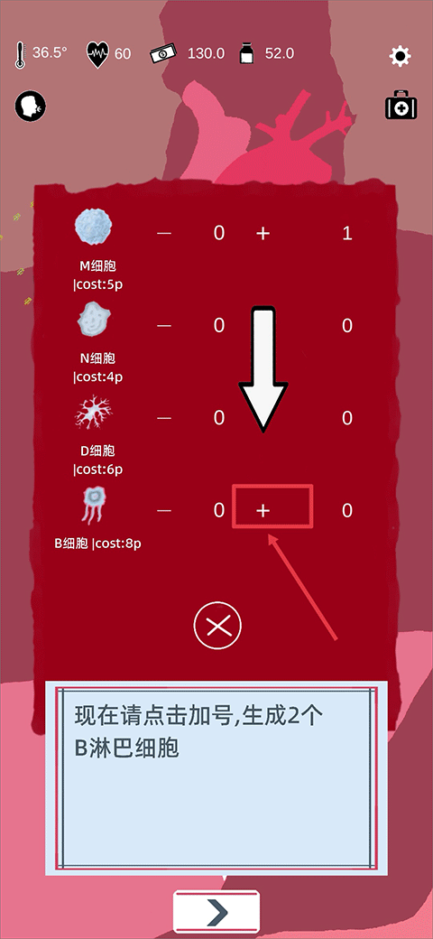 8. 再次点击“淋巴”展开细胞列表,通过点击“+”号可消耗资源增派免疫细胞。