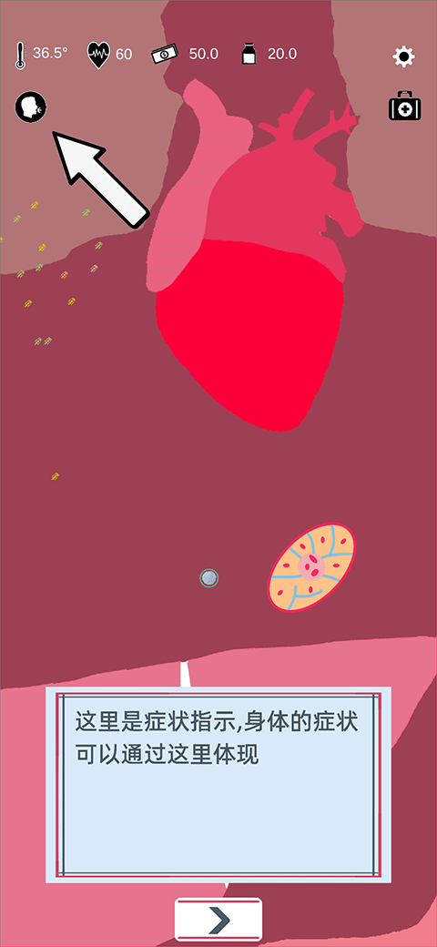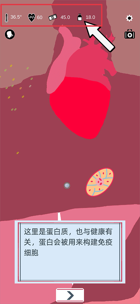 1. 首先熟悉界面核心功能:左上角依次显示体温、心跳、财富与蛋白质四项关键指标。