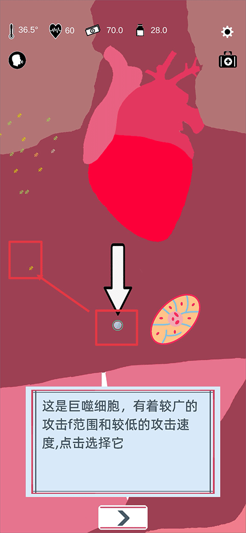 7. 点选巨噬细胞并拖动至病原体附近,即可发起攻击将其清除。