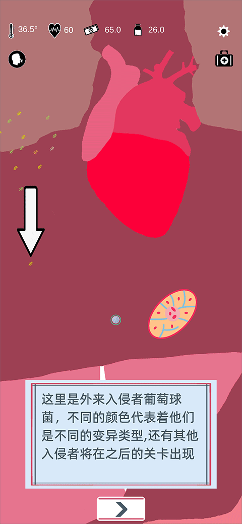 6. 地图上的彩色小点代表入侵病原体(如葡萄球菌),不同颜色标识其变异类型,后续关卡将出现更多复杂敌人。