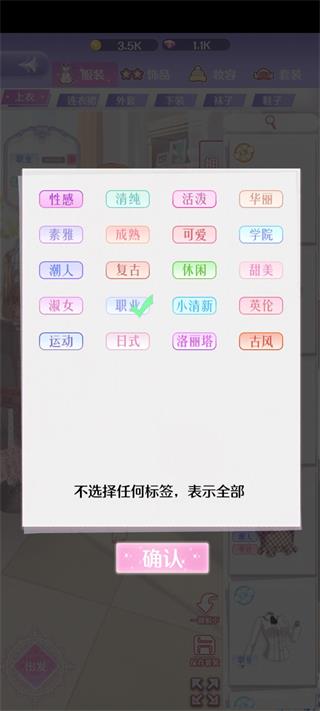 当任务要求同时满足两种风格(例如“职业”+“清纯”)时,建议在搜索栏中同时勾选两个标签,系统将智能返回三类结果:仅含“职业”风格、仅含“清纯”风格,以及同时具备两种风格的服装,大幅提升搭配效率。