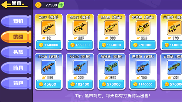 2、获取的金币可以在黑市中购买装备,金币的来源主要通过游戏或广告获取。
