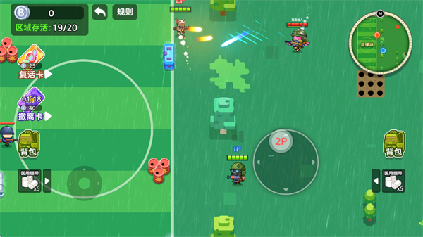 3、游戏分为单人和双人模式,通过滑动左侧屏幕控制1P角色移动,滑动右侧屏幕控制2P角色移动,敌人进入攻击范围即可自动开火,双人模式可以多一份火力也要消耗更多资源。