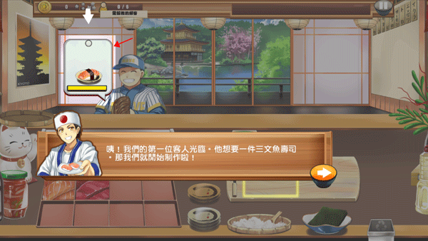 3. 首次进入关卡将触发新手引导,跟随提示熟悉切鱼、卷寿司、上菜等基础操作。