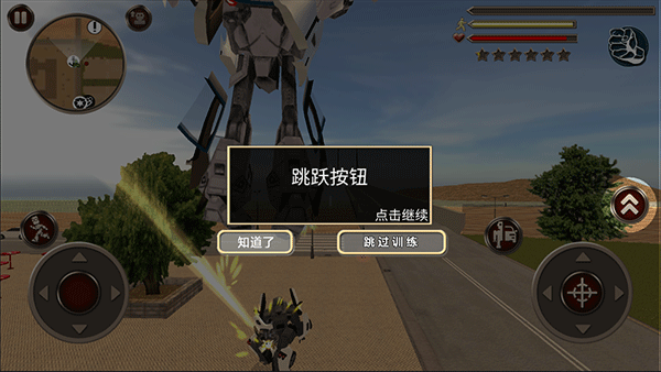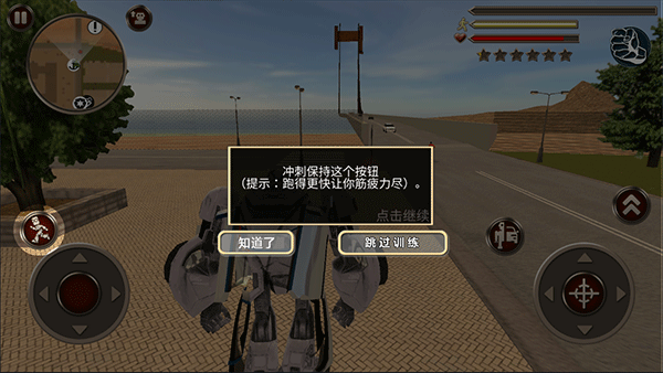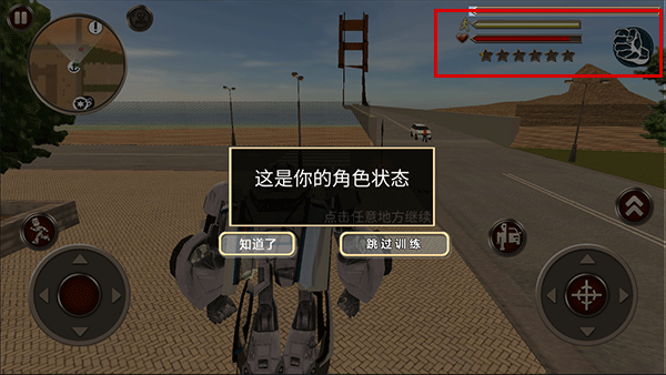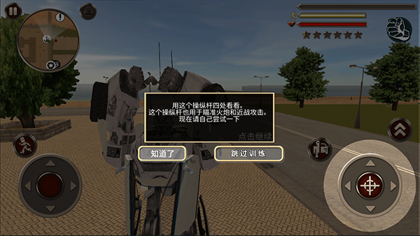 1. 使用左下角虚拟摇杆控制机器人移动,灵活穿梭于城市街区。