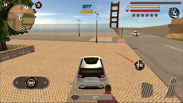 6. 屏幕右上角实时显示角色状态:包括体力、血量及通缉等级;注意避免无故攻击平民,否则将触发警察追捕机制。点击拳头图标可快速切换当前装备的武器。