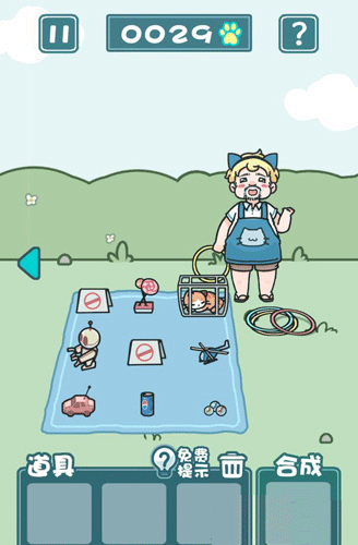 首先获取大叔脚旁的螺丝刀,之后去左边等待一小会捡到遥控车,将两者合成获取电池。获取灌木丛后的硬币,用硬币到大叔那里换到妖娆花。最后把花放在罐子旁边安装上电池,点击瓦罐里出来的猫咪即可。