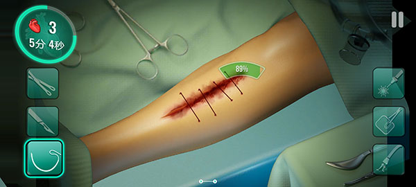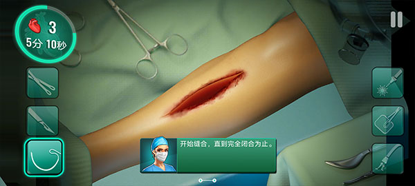 2、按照提示依次对伤口进行缝针操作,当缝合进度达到100%时,该步骤即视为成功完成。