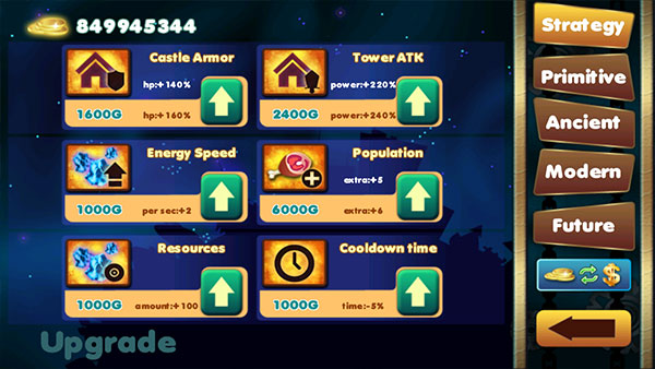 - 返回主界面后,点击“Upgrade”选项,可对已有建筑进行强化,提升整体防御能力。