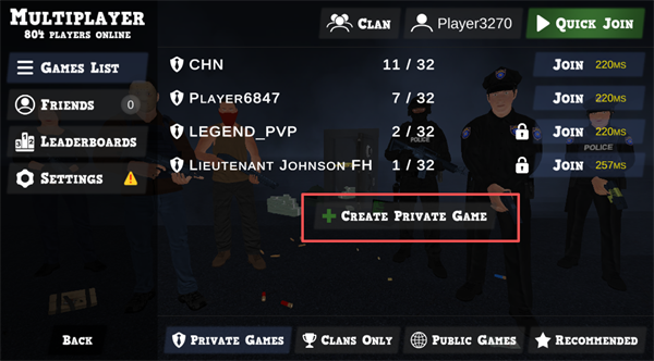 3. 点击「Create Private Game(创建私人游戏)」即可生成专属房间,分享房间号邀请好友一同加入,开启定制化警匪对抗。