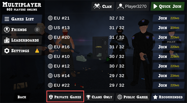 2. 进入多人界面后,点击底部「Private Games(私人游戏)」选项卡,查看或管理私人房间。