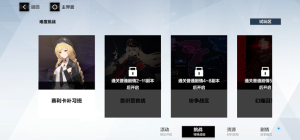自普通剧情2-1起陆续开放,是养成所需各类资源的核心获取途径,共设六类物资关卡,每关分4小节: